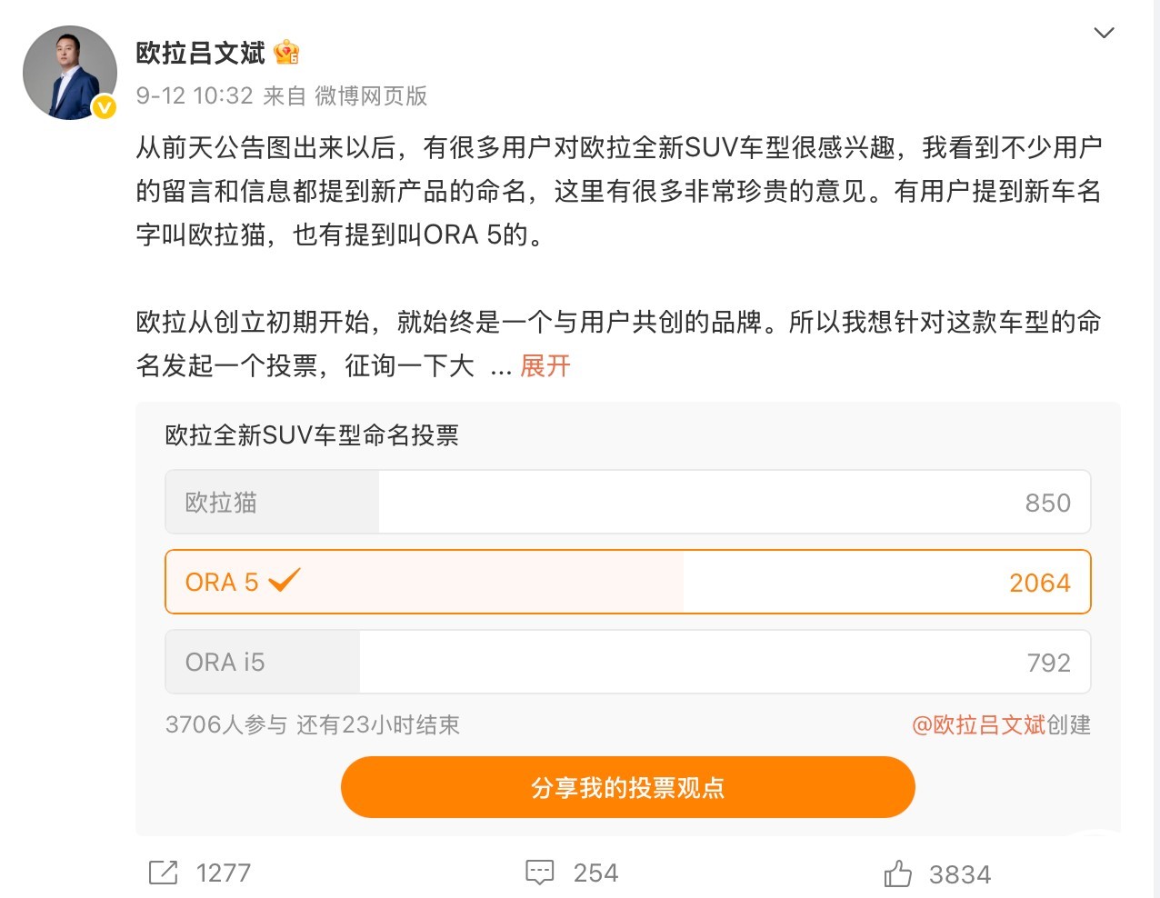 而随着更多信息的露出,关于这台全新SUV的命名也引发关注,欧拉品牌总经理吕文斌更是在微博平台发起投票征集。投票征集中“ORA 5”获得了多数人的认可,笔者也认为这个名字更适合这台全新SUV,不说欧拉车型最初的命名方式就是简单英文字母+数字,目前很多征战全球的车型也都以这样的方式命名,简洁易记也契合欧拉全新SUV全球车型的身份。