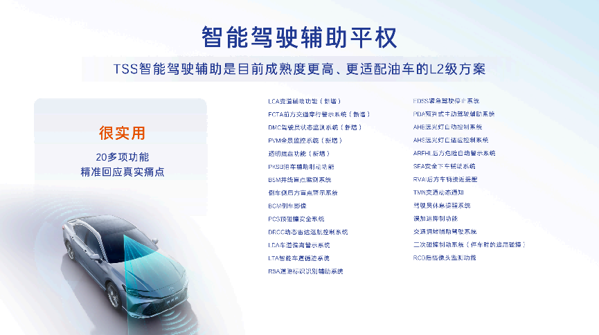 其次是智能驾驶配置,从入门锋兰达到旗舰赛那,全级别配备丰田TSS智能驾驶辅助,覆盖高速、城区、泊车三大场景。基于全球1000亿公里智能驾驶零事故大数据,匹配“安全第一”的开发策略,让安全智能驾驶无需妥协。丰田TSS智能驾驶辅助以最实在的全系标配、全场景覆盖,给出了"智能驾驶平权"的答案。