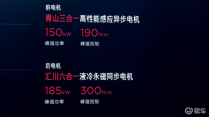 动力方面,新车提供两驱单电机版和四驱双电机版两个动力版本,其中两驱单电机版搭载的电机最大功率185千瓦,并配备59.93千瓦时和80.16千瓦时两种容量的电池组,CLTC续航里程分别为401公里和550公里。四驱双电机版搭载的前电机功率150kW,后电机功率185kW,综合功率335kW(455马力)、综合扭矩490N·m,百公里加速仅需4.5秒,电池方面搭载容量为80.16千瓦时的电池组,CLTC续航里程501公里。此外,该车还搭载一键Boost狂暴模式。