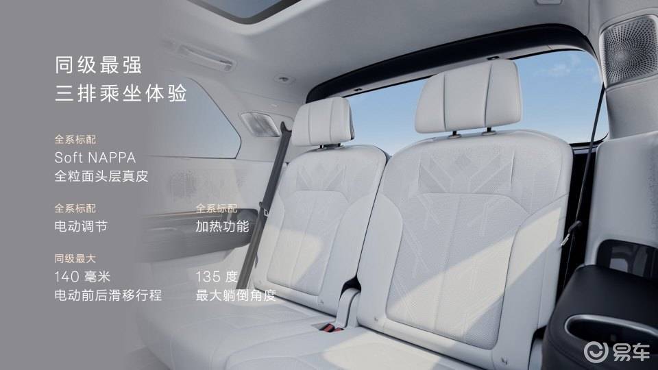 第三排同样不打折。极氪9X采用一体式压铸后端铝车身与强化CD柱结构来保护碰撞安全,能承受时速105公里的追尾与侧碰冲击。第三排还拥有同级最强的乘坐体验,最大135度躺倒角度与同级最大140毫米电动滑移行程,加上专属独立天窗与“坐坐高升”布局,让第三排成为通透明亮的阳光房。