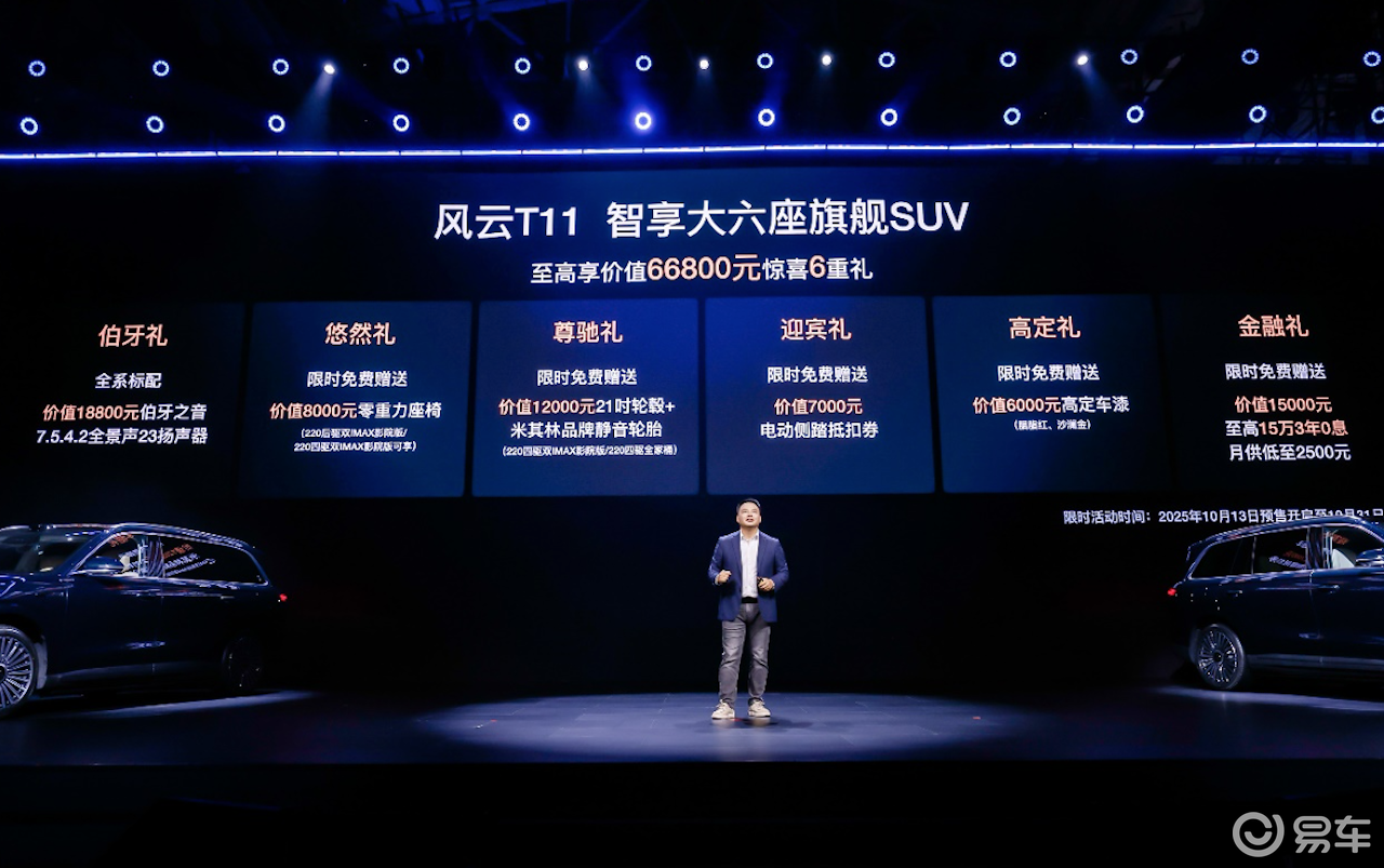 风云T11推出的六重预售权益涵盖音响系统、零重力座椅、轮毂轮胎等多维度配置升级,其中伯牙之音23扬声器、21英寸米其林静音轮胎等高端配置的下放,凸显出品牌冲击主流价格区间的决心。