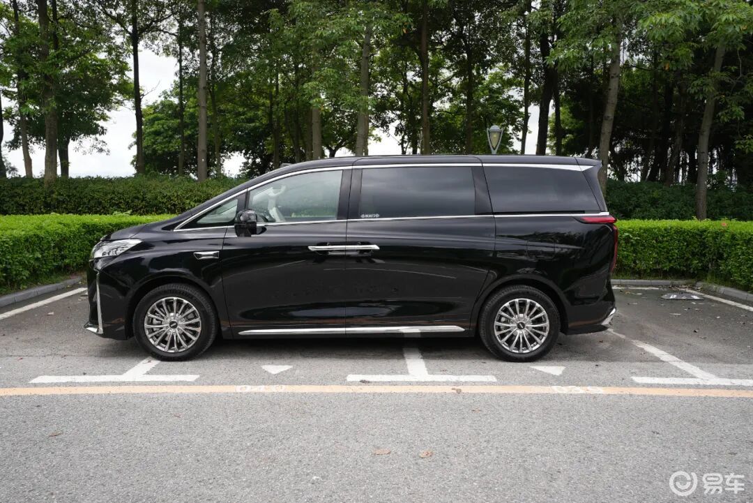 来到车身侧面,平直的车身造型,车顶线条,传统式门把手。车身尺寸方面,高山7的长宽高分别为5050/1960/1900mm,轴距3085mm。配备带隐藏式滑轨的后排电动门。全新高山7可选深空黑、云锦白、远山灰和沧浪青四款配色。