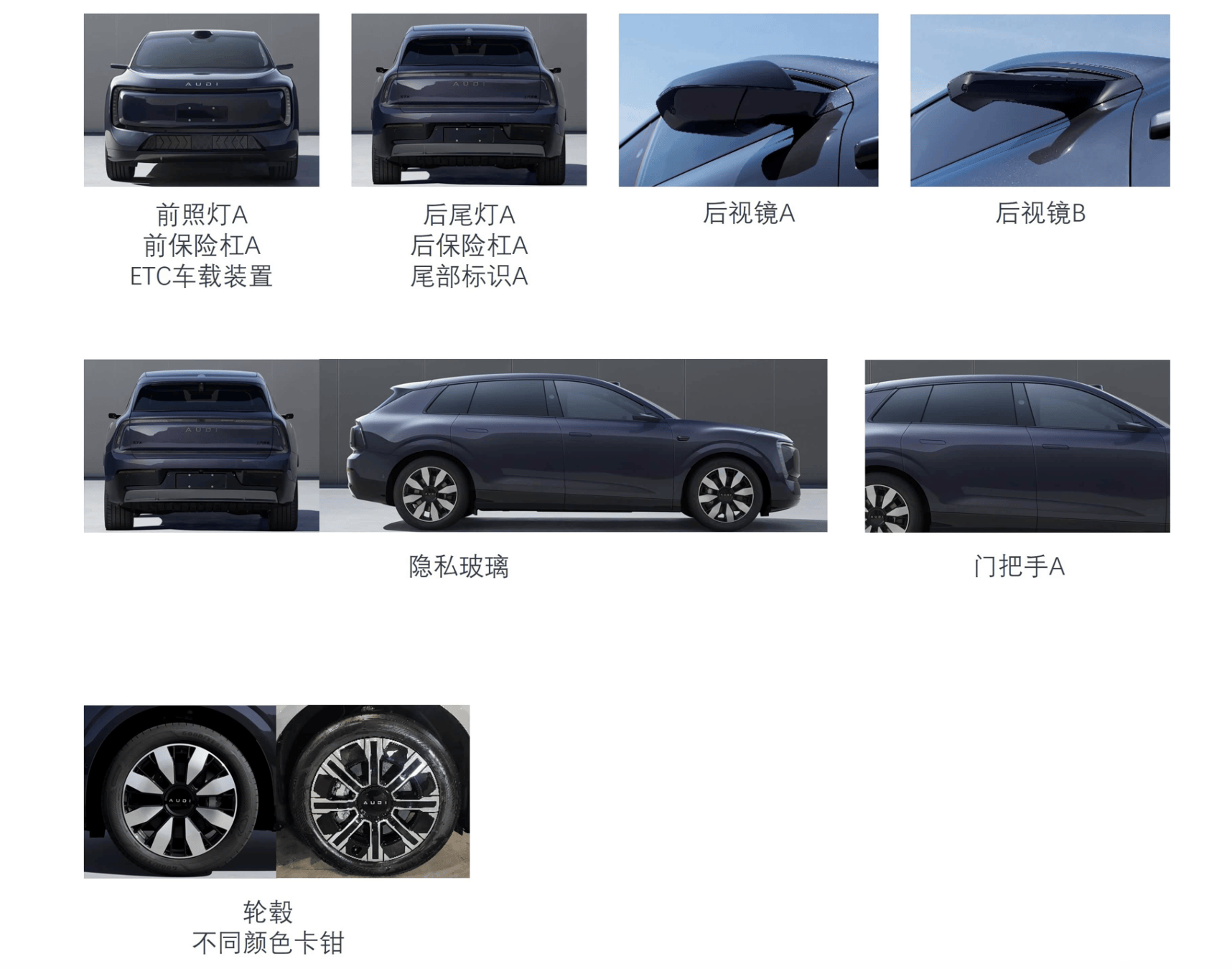 上汽奥迪E7X外观基本还原了去年广州车展首发的AUDI E SUV概念车的原型设计。整体造型流畅且富有科技感。灯厂玩灯,自然不能屈于人后,封闭式前脸配环绕式LED灯带,竖向数字矩阵式大灯支持高分辨率投影功能,可投射迎宾图案、转向箭头或行人警示符号,实现与环境的“灯光交互”。取消了四环标志,用“AUDI”字母代替LOGO,设计语言跟E5 Sportback算是一条脉络。