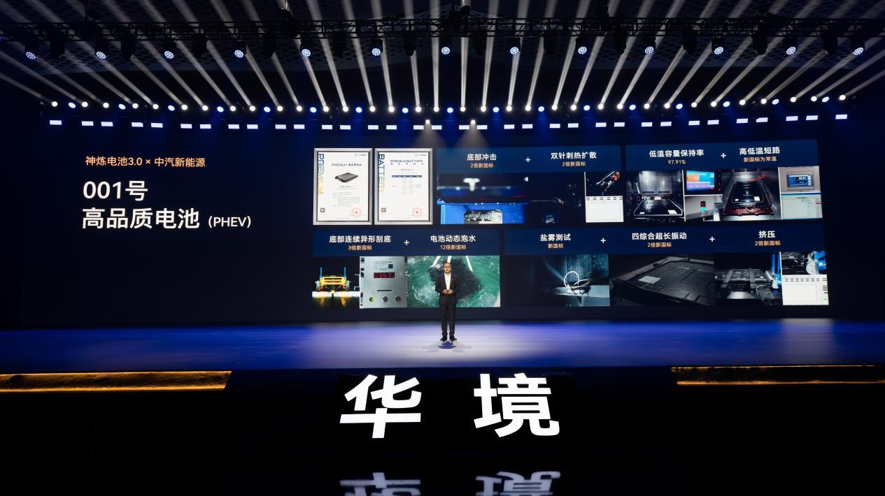 在极限验证中,神炼电池3.0可在裸电芯状态下承受1500J(约为新国标能量的10倍)的底部撞击而不起火、不爆炸,并通过贴近真实用车场景、标准严于新国标的四大串行测试,获得中汽新能源001号(PHEV)高品质电池验证证书。