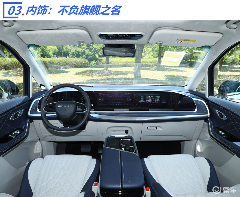 实拍车型采用了一块分段式全景天窗,同时作为顶配型号,MIFA 9在顶棚植入了大量麂皮材质,不仅有不错的手感,视觉上也显得十分豪华。