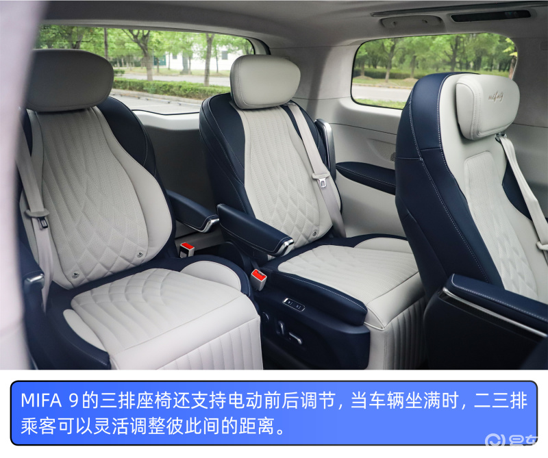 MIFA 9还给二排乘客提供了腿托、脚踏板、二排液晶屏、小桌板以及航空头枕,商务属性丝毫不输目前主流的合资MPV车型,其综合配置水准甚至已经超过同价位的燃油MPV。