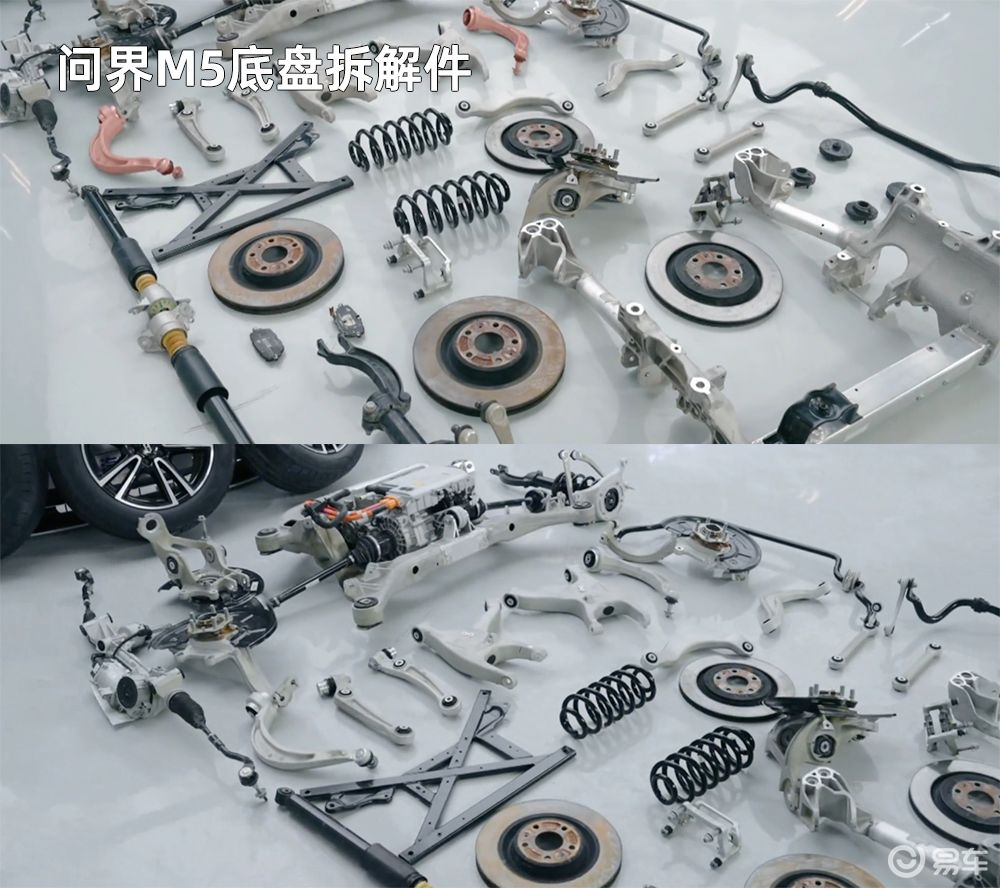 底盘部分,问界M5当年主打“全铝底盘”,大家应该还有点印象,有很多拆车节目也证明了这一点。问界M5不管是纯电版还是增程版,从全框式副车架,到前后悬架的摆臂、羊角等等配件都是铝合金,前后刹车都用了成本相对高的通风盘式,用料比定价24.98万的理想L6都要扎实厚道。悬架结构是前双球节双叉臂独立悬架、后H臂多连杆结构,这在过去可都是30万以上的底盘规格。这些成本花下去,在驾驶体验上还是能够感受出优势的。