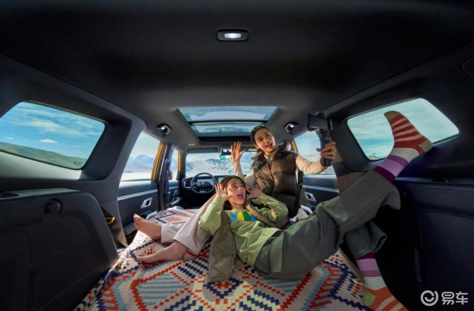 同时,深蓝G318的后排地板纯平,后排坐满人也不用急,座椅还支持180度放平,从而让后备箱容积最大达到1747L,能够放下29个20寸行李箱,平时拉点货物也丝毫没有问题。而且后排座椅放平后还带来双人床的空间,一家三口睡进去也丝毫不觉得拥挤,周末一家人去户外野餐、露营,遇到雨雪天气的时候,一家人可以睡在车内,听着高端音响、透过天窗欣赏瑰丽的星空,体验感真的拉满了。