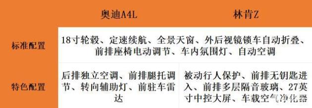 奥迪A4L增加了后排独立空调、前排腿托调节、转向辅助灯、前驻车雷达等配置,轮胎尺寸也加宽至245mm(林肯Z为235mm)。而林肯Z则配备了被动行人保护、前排无钥匙进入、前排多层隔音玻璃、27英寸中控大屏和车载空气净化器等功能,这些配置在奥迪A4L上并未配备。