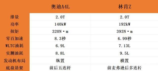 值得一提的是,奥迪A4L采用了纵置发动机布局,底盘方面则采用前后五连杆式独立悬架,这一点比采用横置发动机布局和前麦弗逊式独立悬架的林肯Z更为高级。