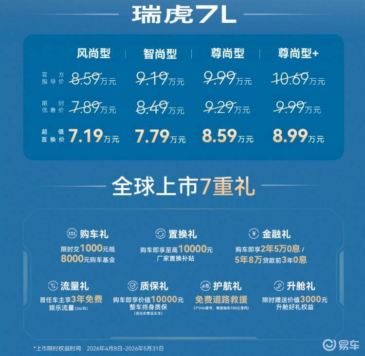具体来看,瑞虎7L推出4款车型,官方指导价8.59-10.69万元,限时优惠价7.89-9.99万元,超值置换价7.19-8.99万元,其中包含限时交1000元抵8000元购车基金,至高1万元厂商置换补贴,2年5万0息或5年8万贷款前3年0息等购车福利;全新瑞虎7推出3款车型,官方指导价7.99-9.19万元,限时优惠价6.99-8.19万元,包含限时赠送1万元购车基金,5年6万贷款前3年0息等。