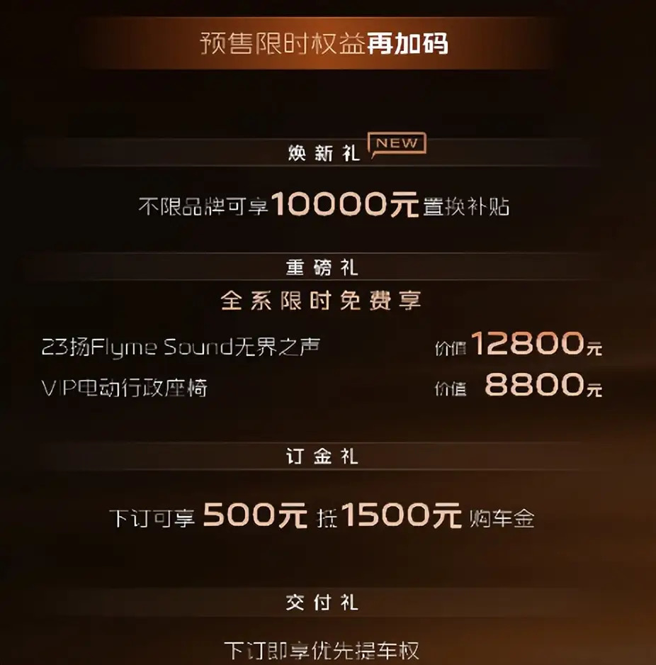 【多重限时权益,价值感拉满】为回馈首批用户,吉利官方推出多项上市限时礼遇:即日起至6月30日下定可享1万元置换补贴,并免费升级价值1.28万元的Flyme Sound无界之声音响与价值8800元的VIP电动行政座椅。此外,还有金融礼、质保礼、流量礼等七重好礼叠加,显著提升购车性价比。